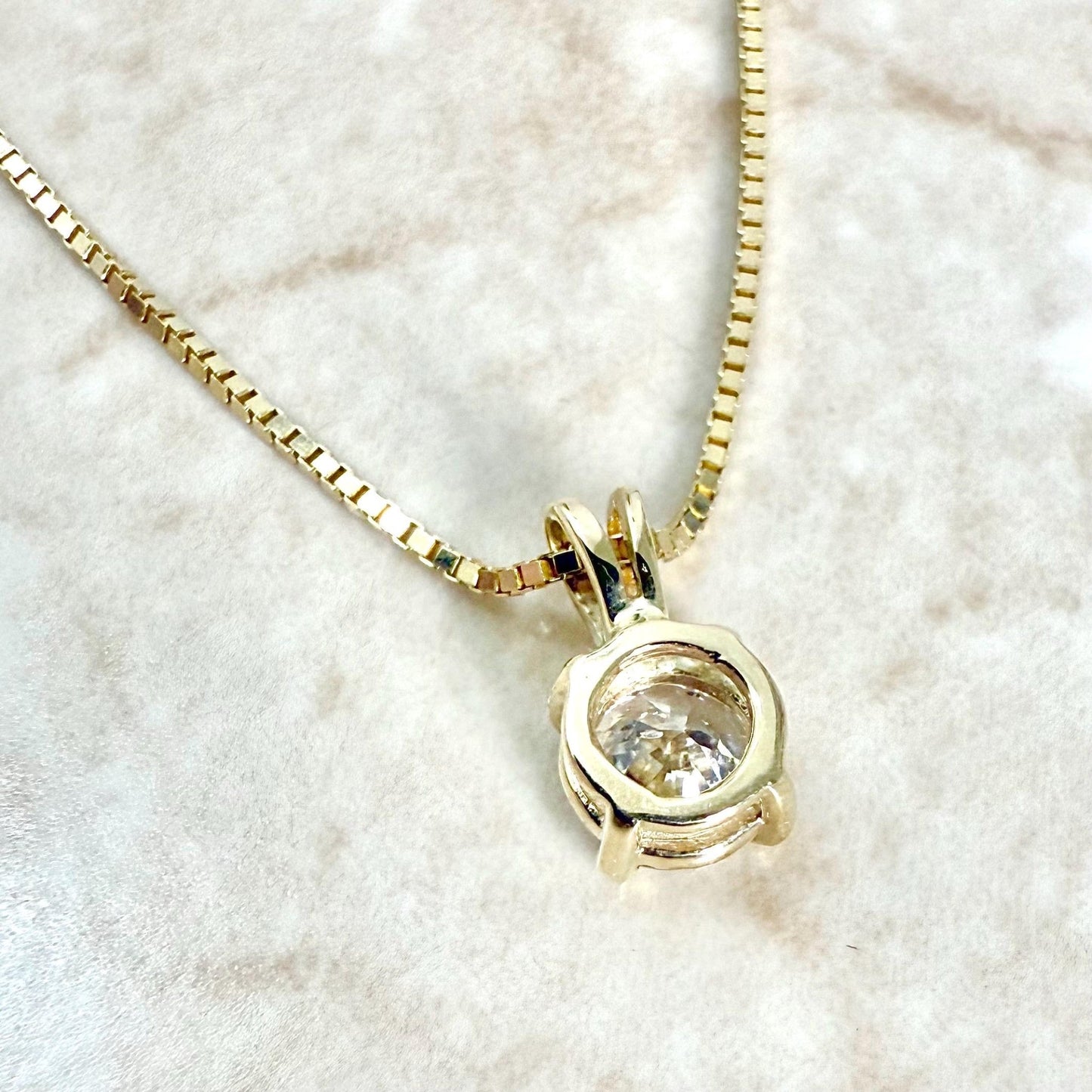 A spectacular vintage 14 karat yellow gold solitaire pendant necklace set with a 5.56 mm natural round diamond weighing approximately 0.70 carat.