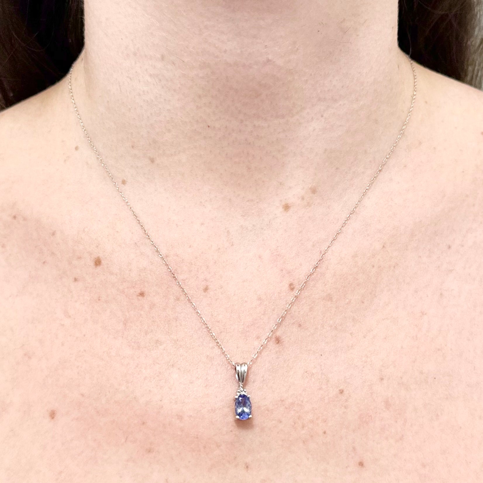 14 karat white gold tanzanite and diamond pendant. It features a natural oval tanzanite weighing approximately 1/2 carat (7.06 x 4.89 mm).