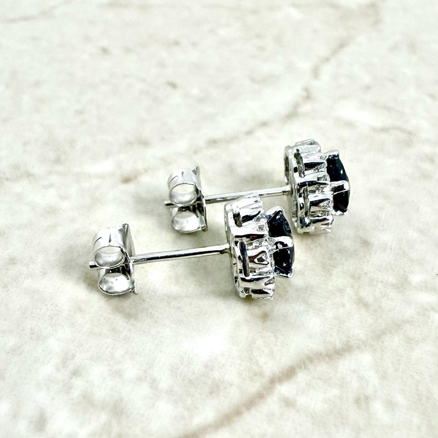 Beautiful pair of vintage platinum & 14k white gold blue sapphire & diamond halo stud earrings.