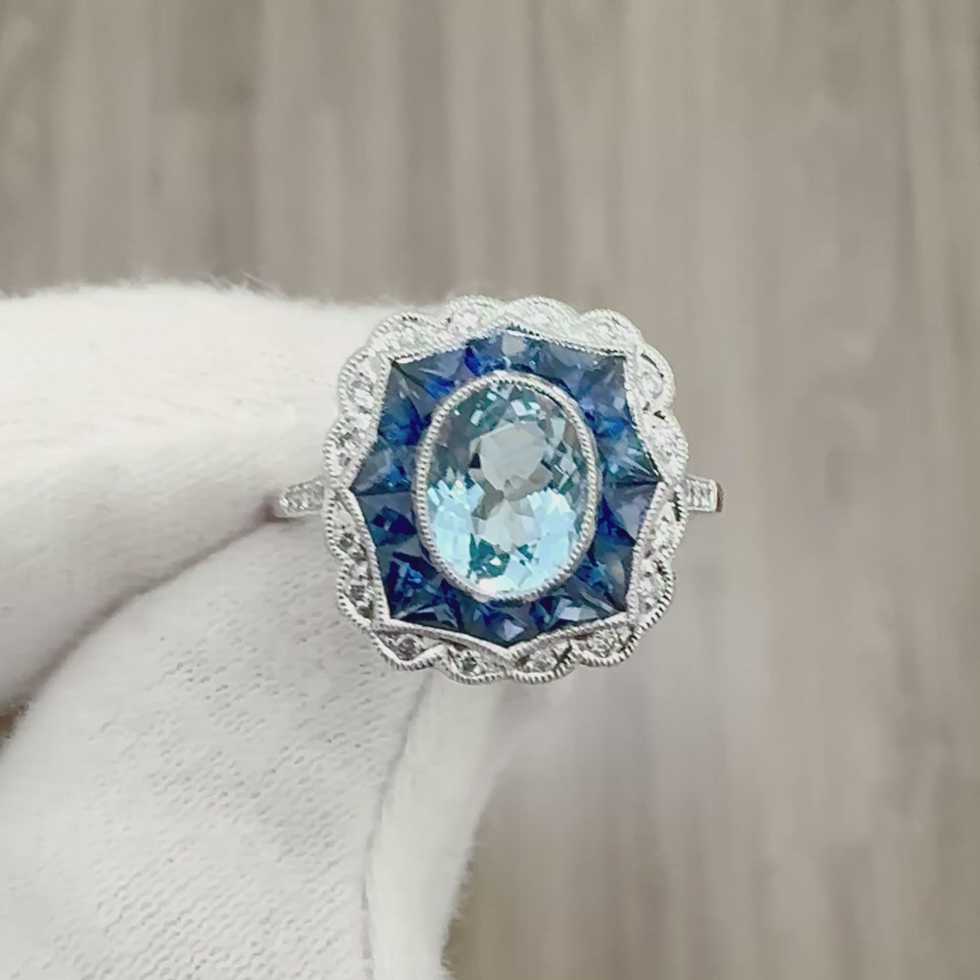 Gorgeous handcrafted platinum Art Deco style oval aquamarine, sapphire and diamond halo ring!