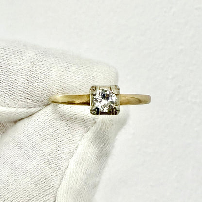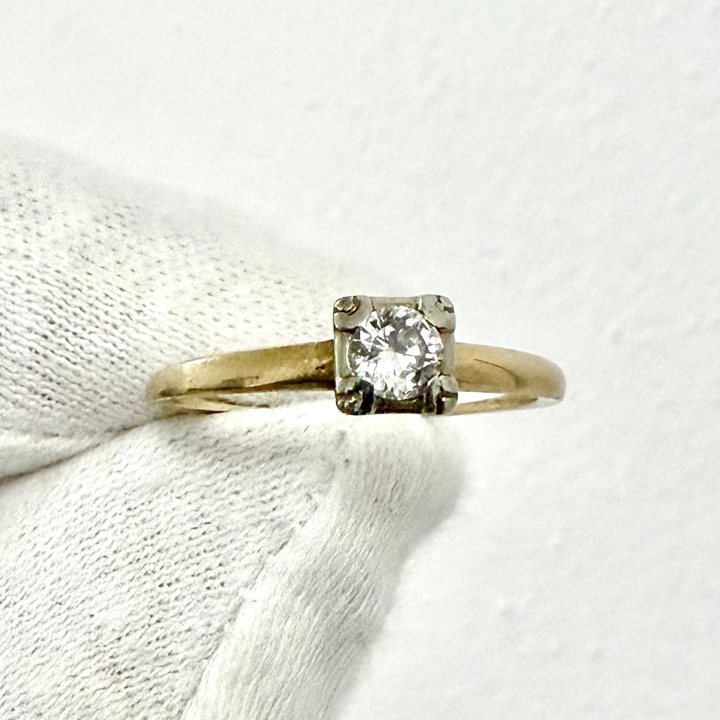 Beautiful vintage 1940’s natural diamond solitaire ring crafted in 14k yellow & white gold. It is set with a round diamond weighing approximately 0.21 carat (3.75 mm).